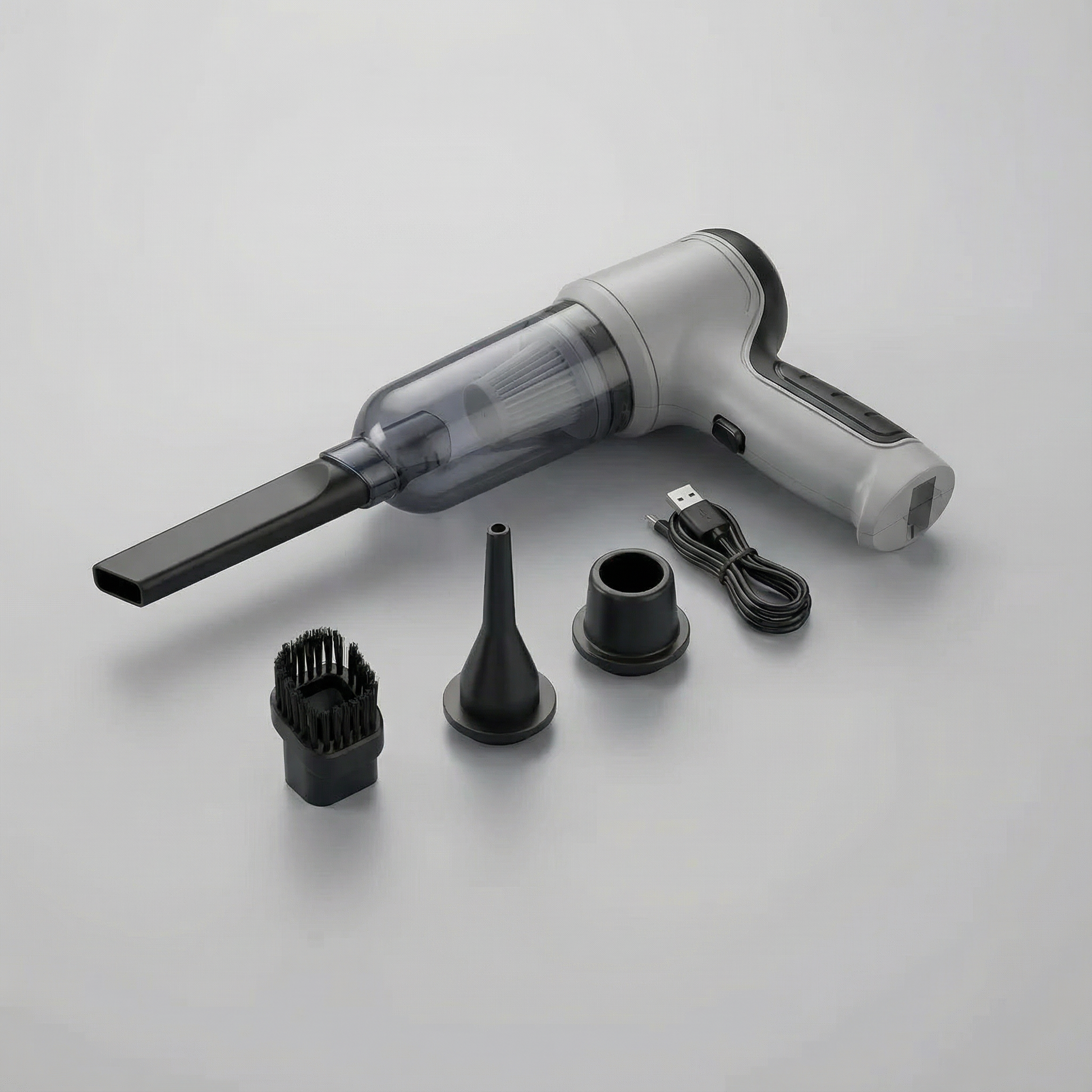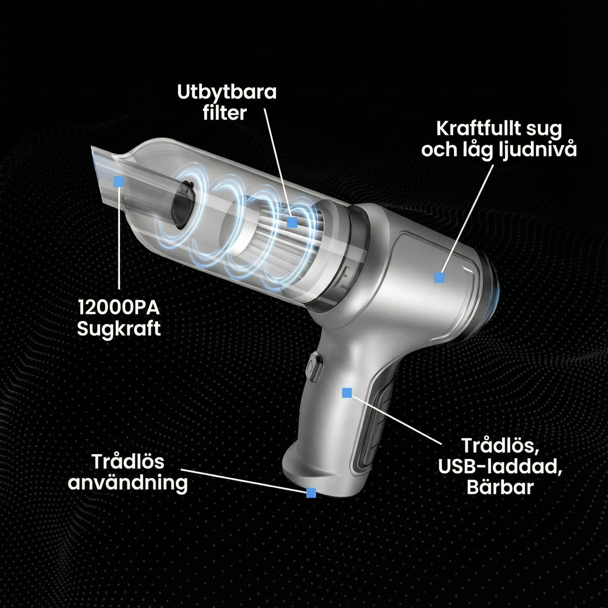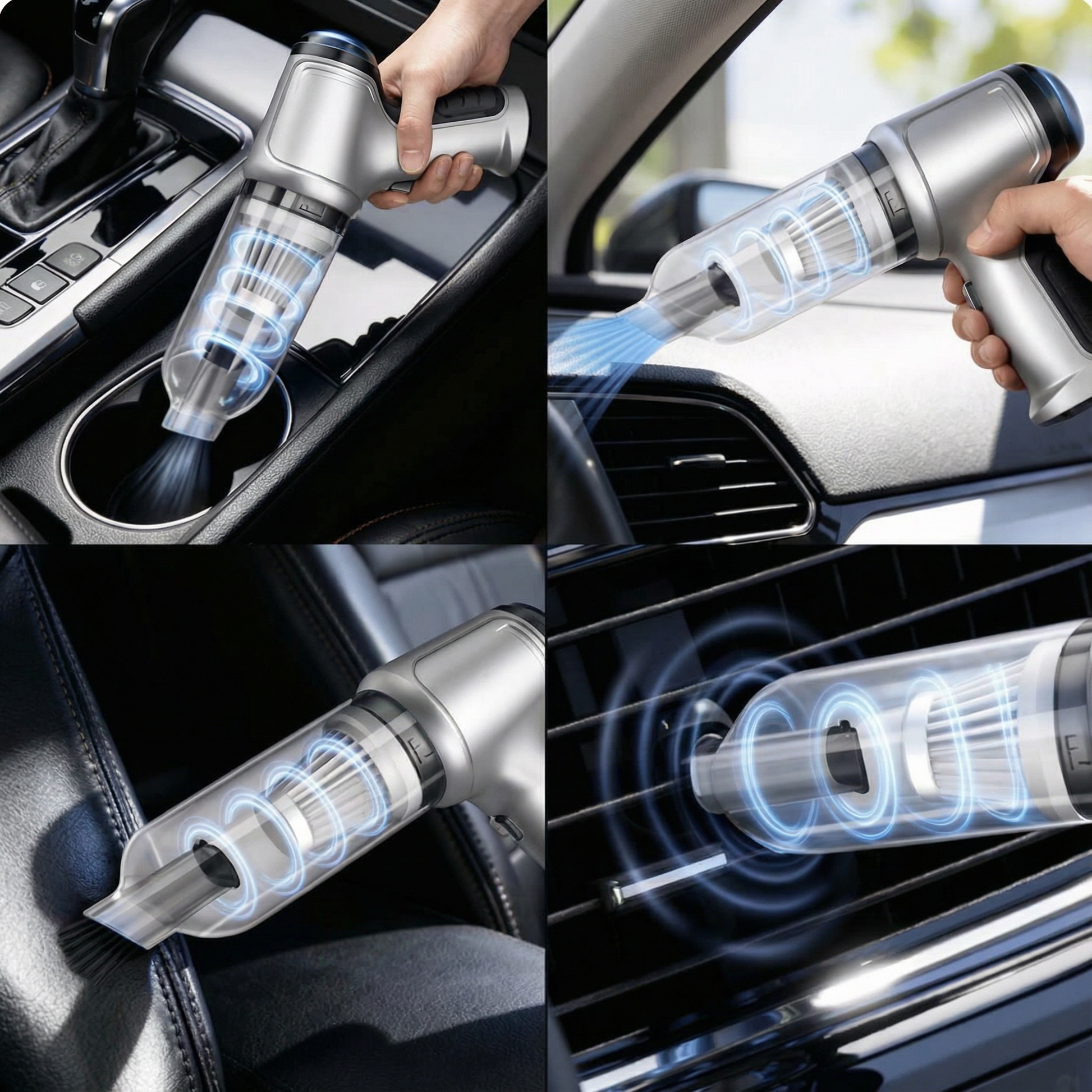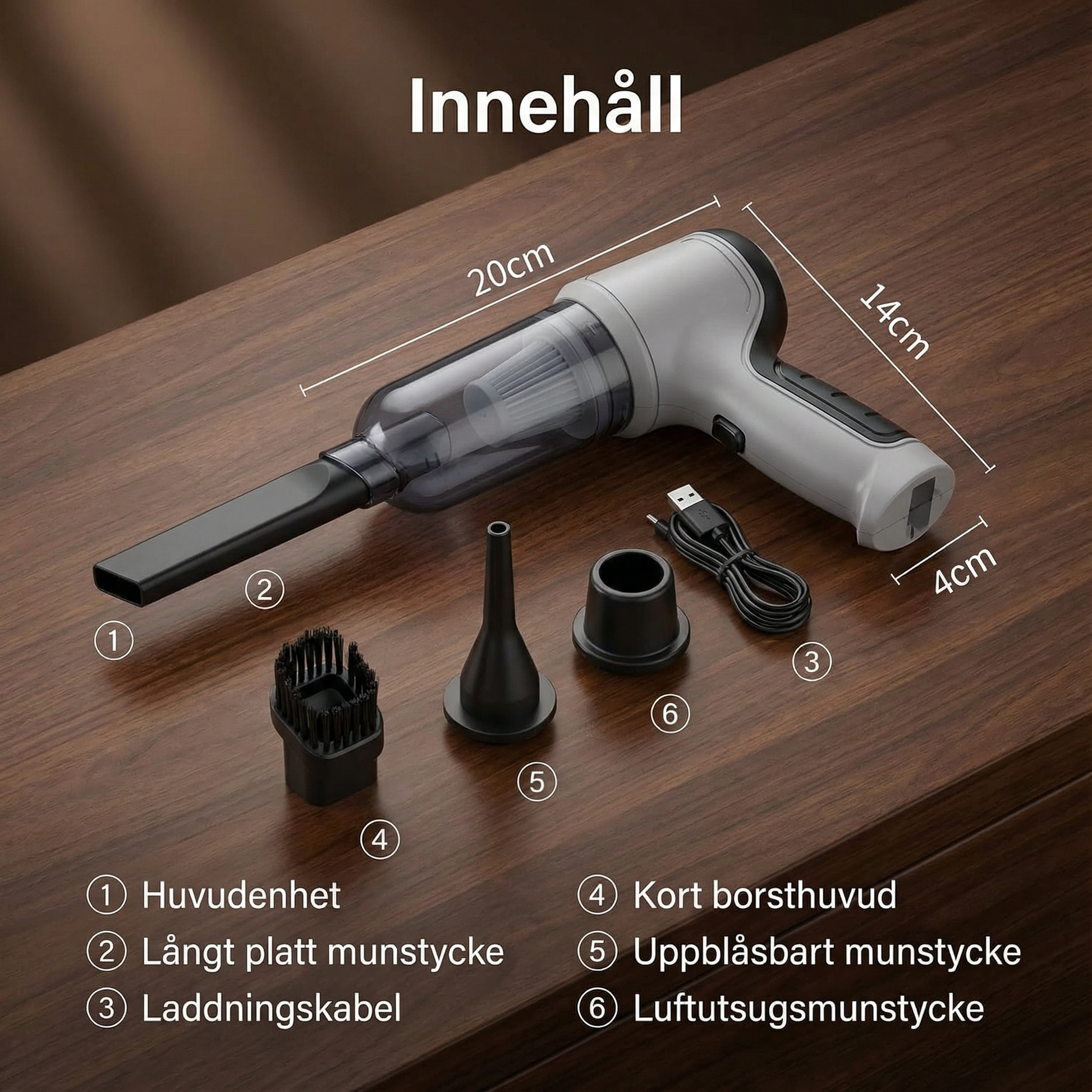 Varje produkt levereras med fyra specialanpassade rengöringsmunstycken för olika ytor: säten, mattor, instrumentbräda, ventilationsuttag och trånga utrymmen. Inga extra tillbehör behöver köpas till.
